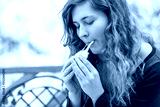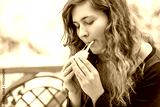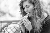 Young woman sitting on chair, holding, eating one piece of homemade mochi sticky glutinous Japanese rice cake dessert outdoors, outside on deck