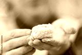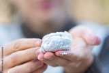 Young man holding, showing, offering one homemade mochi sticky glutinous Japanese rice cake dessert in front of camera, outdoors, outside on deck in both, two hands