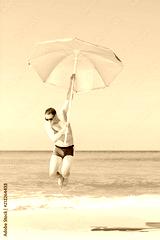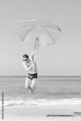 Young attractive fit man, male, happy, smiling, jumping mid-air, in air on beach on sunny day with red sunglasses in Florida panhandle with ocean, holding umbrella