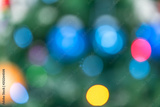 Blurred colorful, multicolored, multi-colored, Christmas tree ornament bokeh background round circles of green, red, orange, blue colors