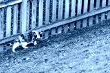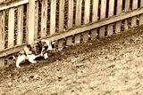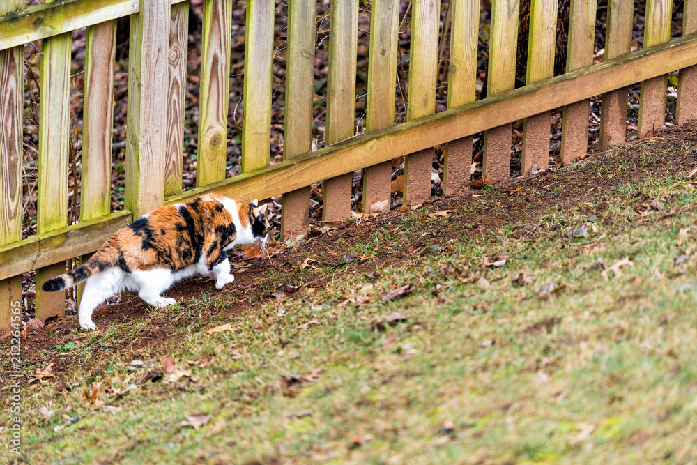 Calico cat, curious, exploring, sniffing smell, scents territory by house backyard garden, wooden fence, green grass in autumn, winter or spring, fallen dry brown leaves