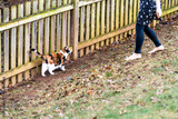 Calico cat, woman, female owner walking together, curious, exploring house backyard by garden wooden fence, green grass in autumn, winter, spring with dry fallen brown leaves