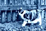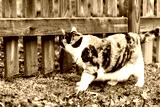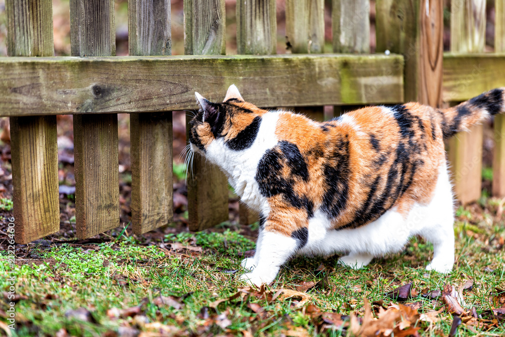 Closeup of calico cat, curious, exploring, sniffing smell, scents by house backyard garden, wooden fence, green grass, fallen dry brown leaves