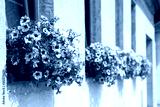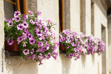 Flowerpots with blooming petunia in windows