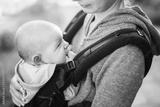 Little baby girl and her mother walking outside during sunset. Mother is holding and tickling her baby, babywearing in the carrier