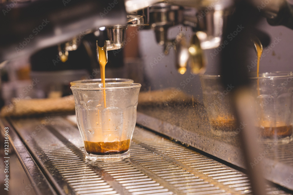 espresso coffee shot pouring into piccolo clear grass from a espresso machine in cafe. close-up