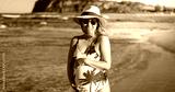portrait pregnancy woman in summer swimsuit, hat and sunglasses standing on beach