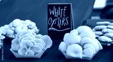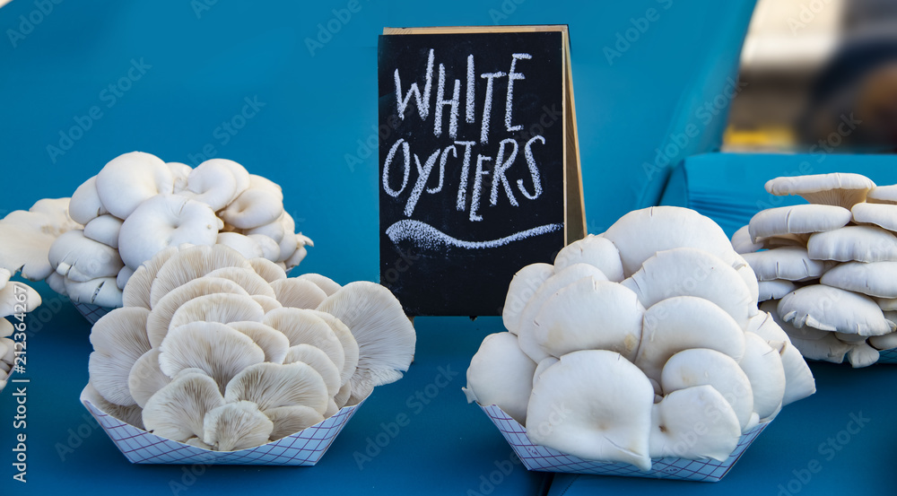White oyster mushrooms displayed for sale on a pretty blue tablecloth at farmers market