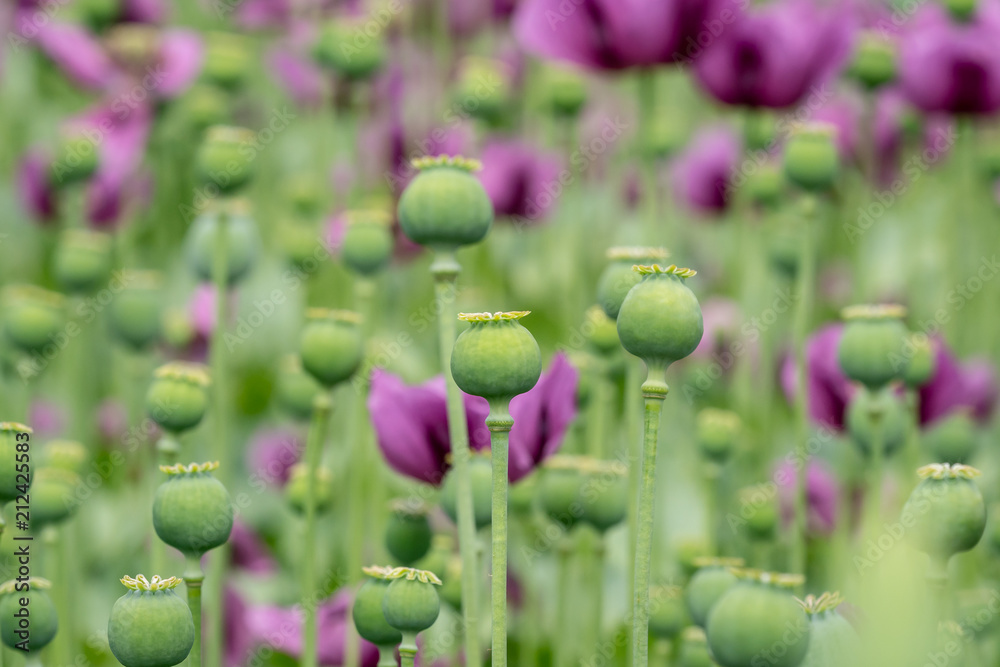 Green opium poppy capsules, purple poppy blossoms in a field. (Papaver somniferum). Poppies, agricultural crop.