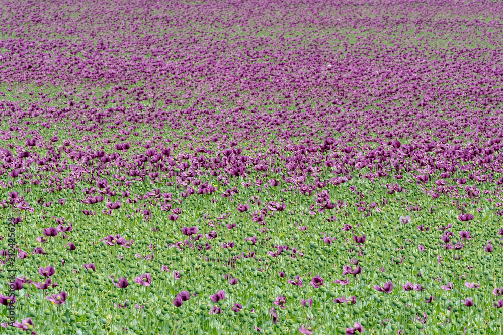 Purple poppy blossoms in a field. (Papaver somniferum). Poppies, agricultural crop.