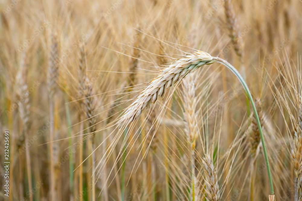 Wheat field. Golden ears of wheat on the field. Background of ripening ears of meadow wheat field. Rich harvest Concept