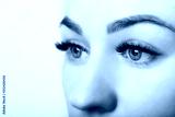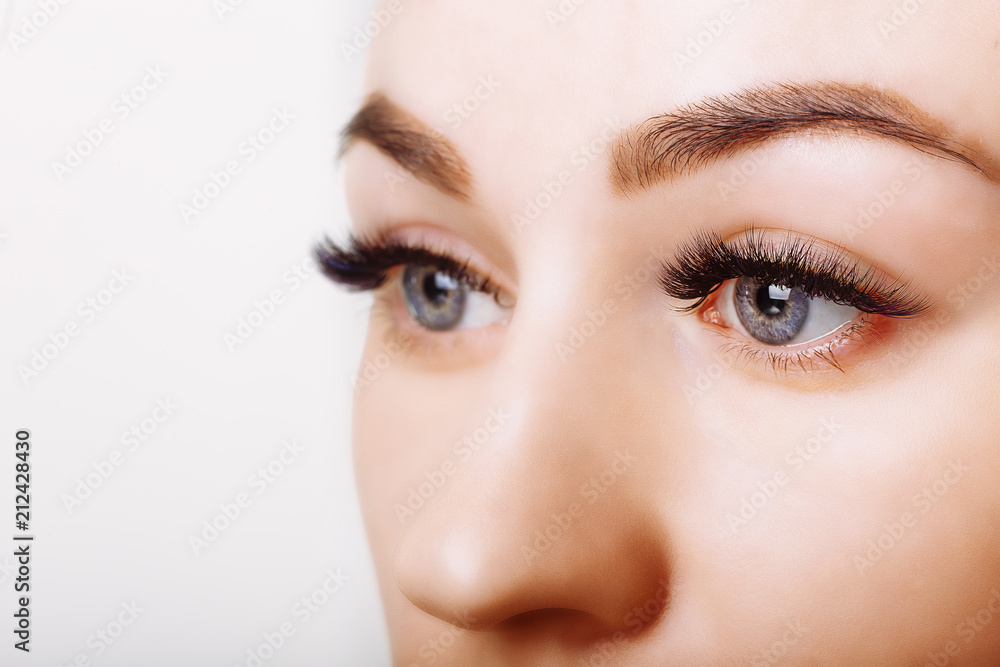 Eyelash Extension Procedure. Woman Eye with Long Eyelashes. Close up, selective focus.