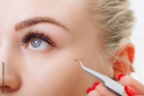 Eyelash Extension Procedure. Woman Eye with Long Eyelashes. Close up, selective focus.