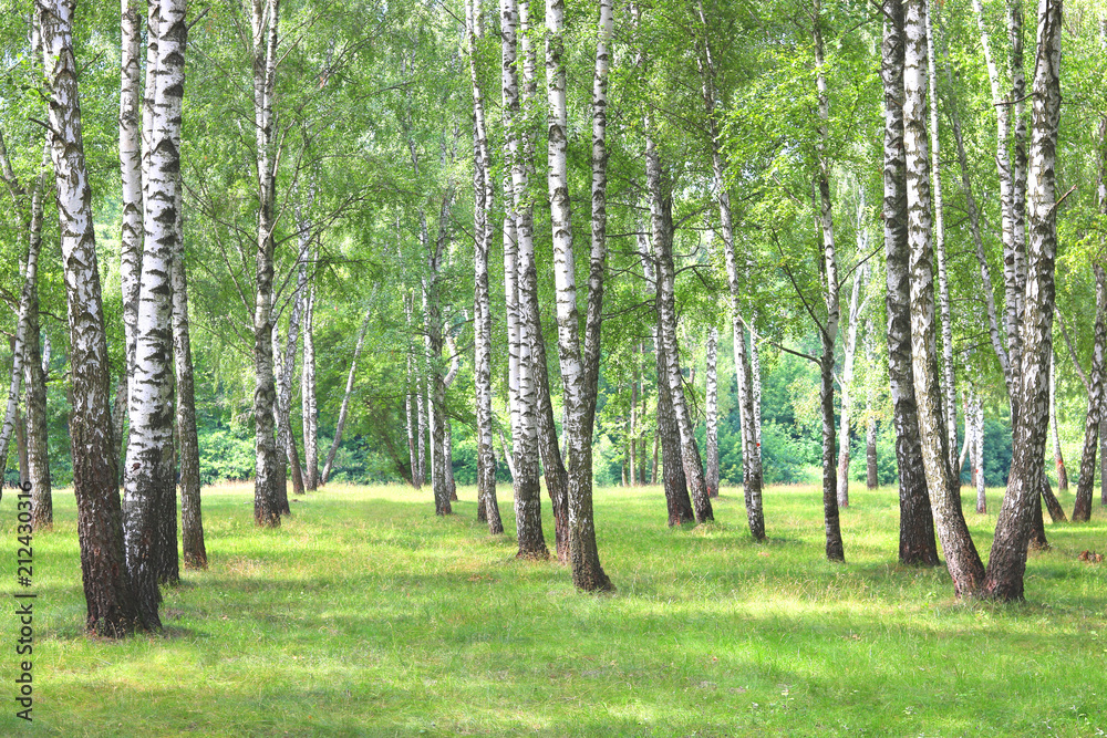 Beautiful birch trees with white birch bark in birch grove with green birch leaves in summer