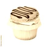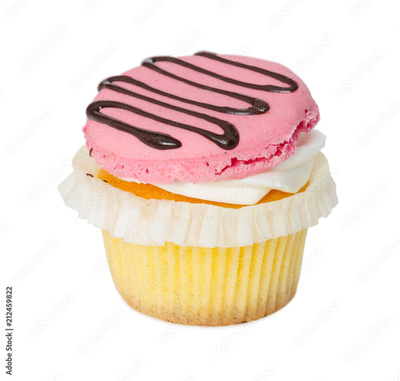 Cupcake with vanilla cream and strawberry macaroon isolated on white