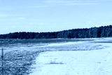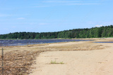 Lake Shore Sandy Beach and Nearby Tree Forest, Scenic Nature View. Landscape of Empty Beach and Sea Water in Countryside Panoramic Travel Spot. Outdoor Image of Beautiful Vacation Destination.