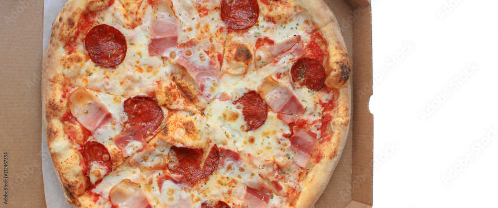 Meat Supreme Pizza in Delivery Box Close Up Top View. Sliced Pizza Pie with Pepperoni Sausage, Bacon, Cheese and Tomato Sauce. Cropped Image of Pizza in Box with Empty White Background.