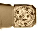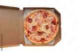 Pizza in Open Delivery Paper Box Isolated on White Empty Table Background. Top View of Fresh Cooked Traditional Italian Pizza with Bacon, Pepperoni Sausage, Chicken, Cheese Toppings and Tomato Sauce.