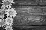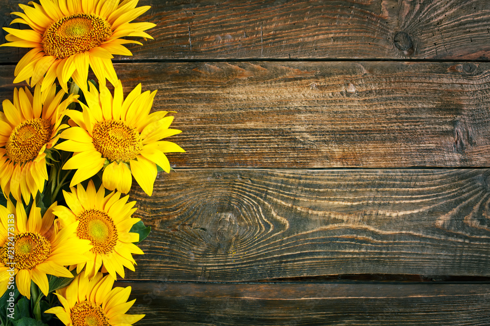 Beautiful sunflowers on a wooden table. View from above. Background with copy space.
