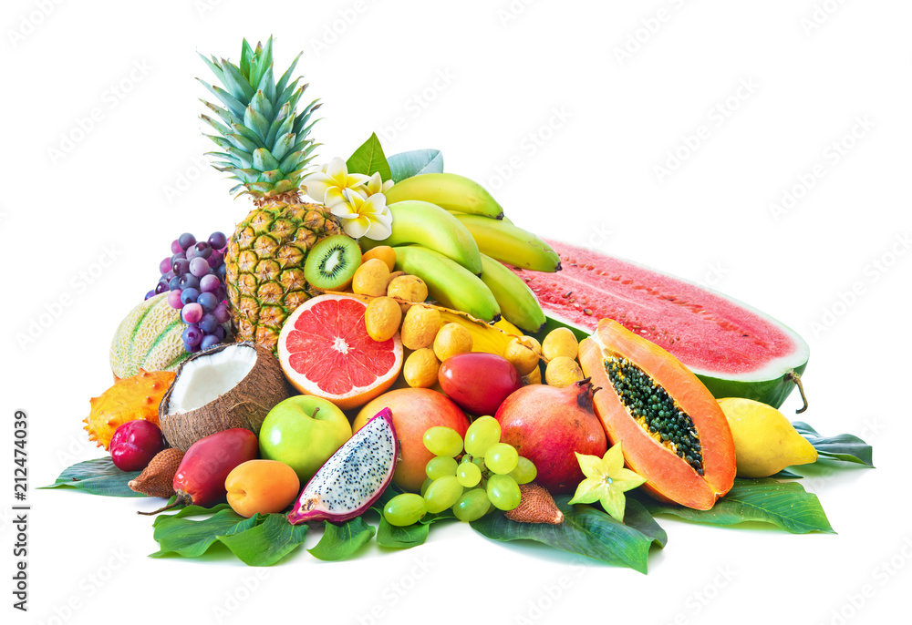 Assortment of tropical fruits with palm leaves and exotic flowers