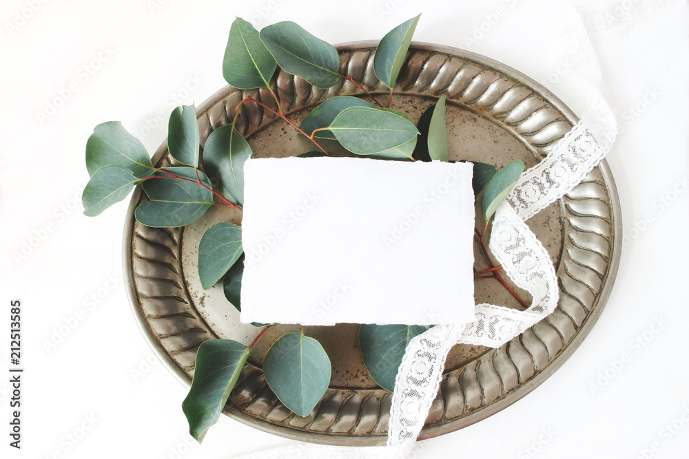 Styled stock photo. Feminine wedding still life composition, mockup scene with vintage silver tray, blank cotton paper card, lace ribbon and eucalyptus leaves and branches. White table background.