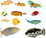 Tropical reef fish isolated on white background. Snapper, boxfish, Parrotfish, Bannerfish, Squirrelfish, Goatfish, Wrasse, Triggerfish