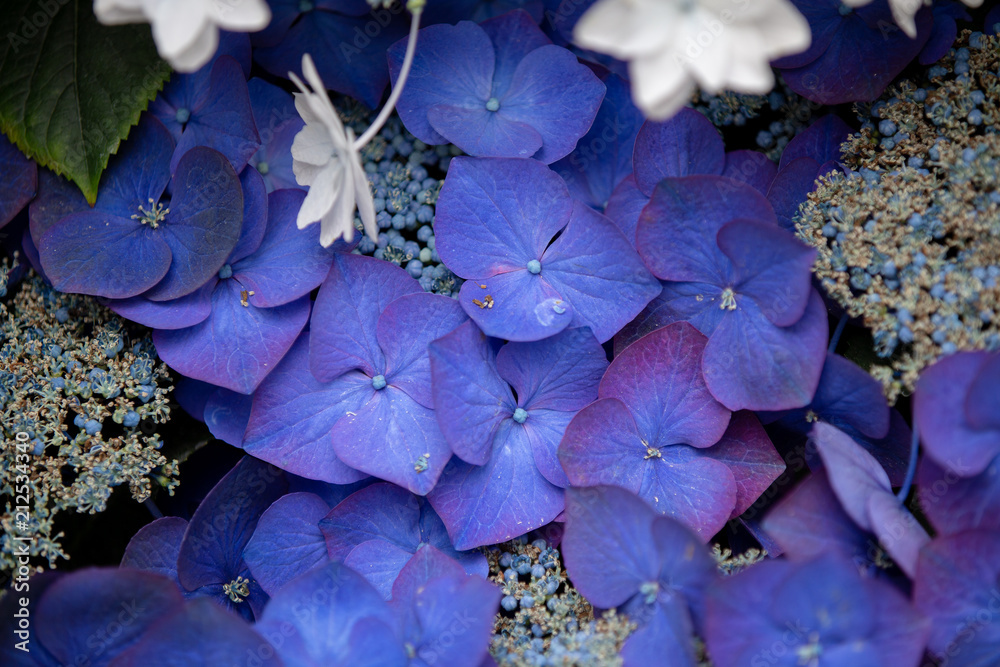 Close-up of Hydrangea serrata, Orchidaceae background.