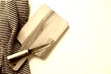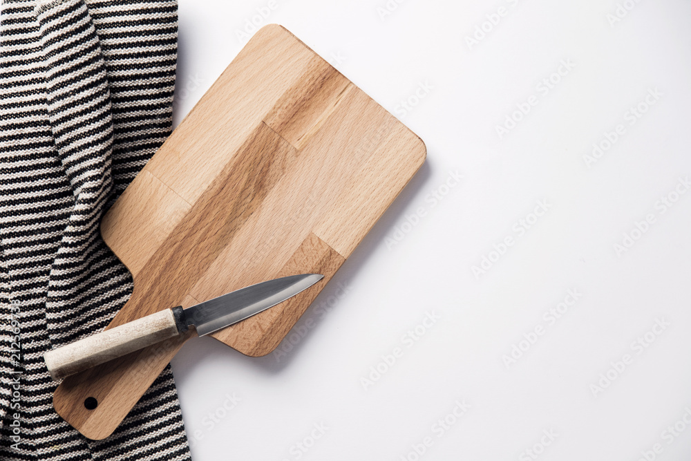 Wooden chopping board and knife with a striped cloth