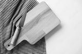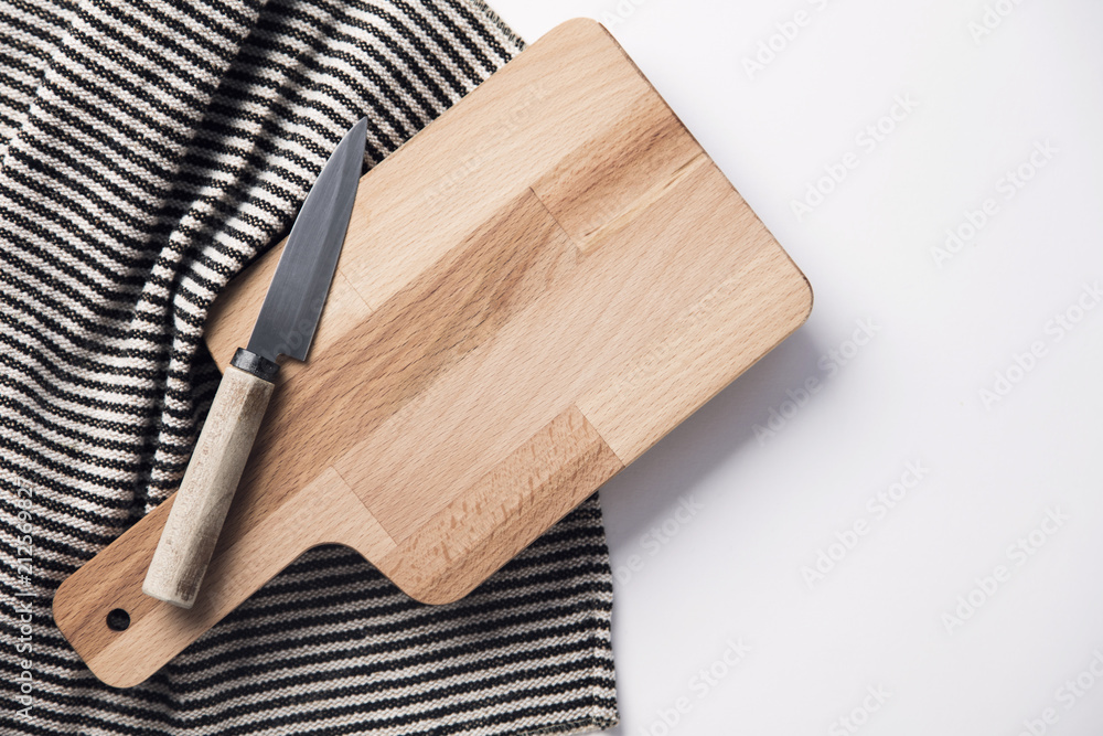 Wooden chopping board and knife with a striped cloth