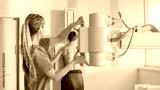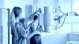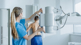 In the Hospital, Man Standing Face Against the Wall While Medical Technician Adjusts X-Ray Machine For Scanning. Scanning for Fractures, Broken Limbs, Chest, Cancer or Tumor. Modern Hospital