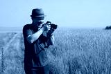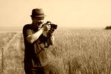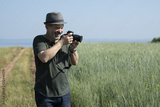 A man with a camera on the background of a wheat field. Concept: summer vacation.