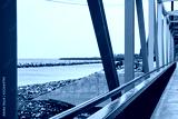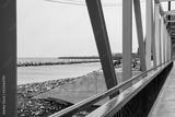 A contemporary brightly coloured metal rainbow truss bridge over a sea inlet in Tenerife.