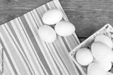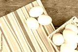 Many raw hen eggs in wicker basket and three eggs apart on old vintage wooden table