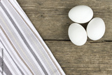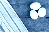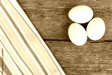 Three raw white hen eggs on old vintage wooden table, covered with striped beige cloth
