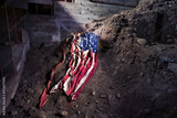 Symbolic Tattered and Torn American Flag on the Ground in Dirt