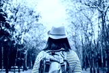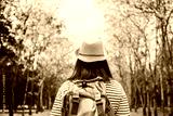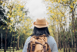 Back of young traveler woman backpacker looking forward at forest in autumn season,Freedom wanderlust travel.solo backpack.
