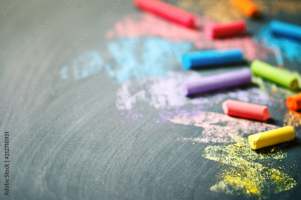 Colorful crayons on the blackboard, drawing. Back to school background.