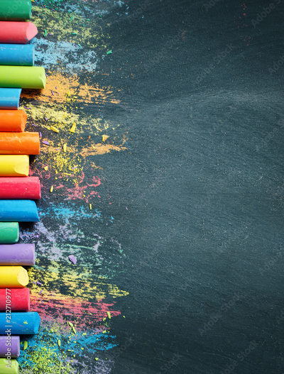 Colorful crayons on the blackboard, drawing. Back to school background.
