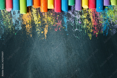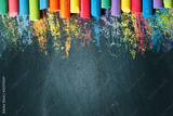 Colorful crayons on the blackboard, drawing. Back to school background.