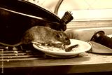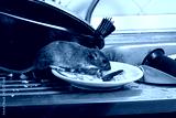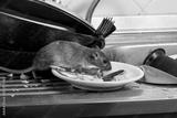 Close-up young rat (Rattus norvegicus) sniffs leftovers on a plate on sink at the kitchen. Fight with rodents in the apartment. Extermination.