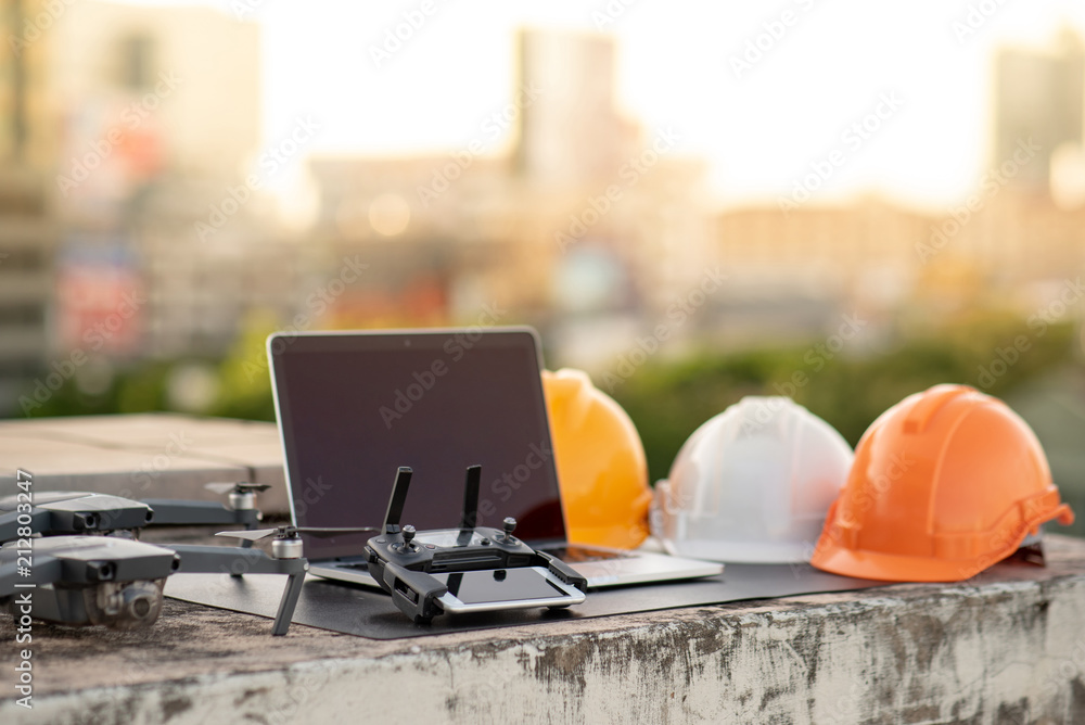 Drone, smartphone, laptop computer and protective helmet at construction site. Using unmanned aerial vehicle (UAV) for land and building site survey in civil engineering project.
