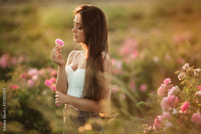 Happy smiling woman is resting in pink blossom garden of beautiful roses over sunset lights