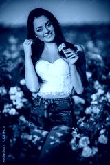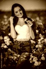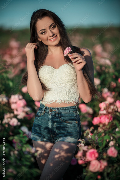 Happy smiling woman is resting in pink blossom garden of beautiful roses