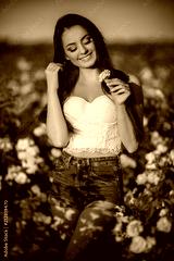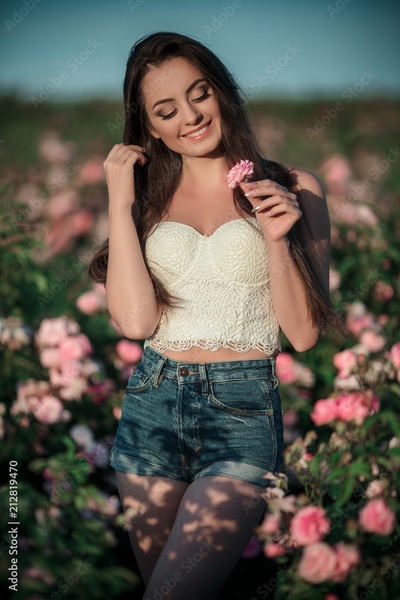 Happy smiling woman is resting in pink blossom garden of beautiful roses
