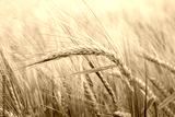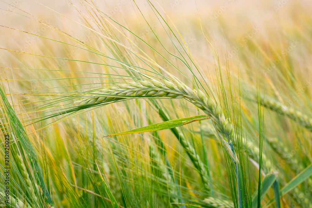 Wheat field. Green ears of wheat on the field. Background of ripening ears of meadow wheat field. Rich harvest Concept
