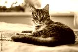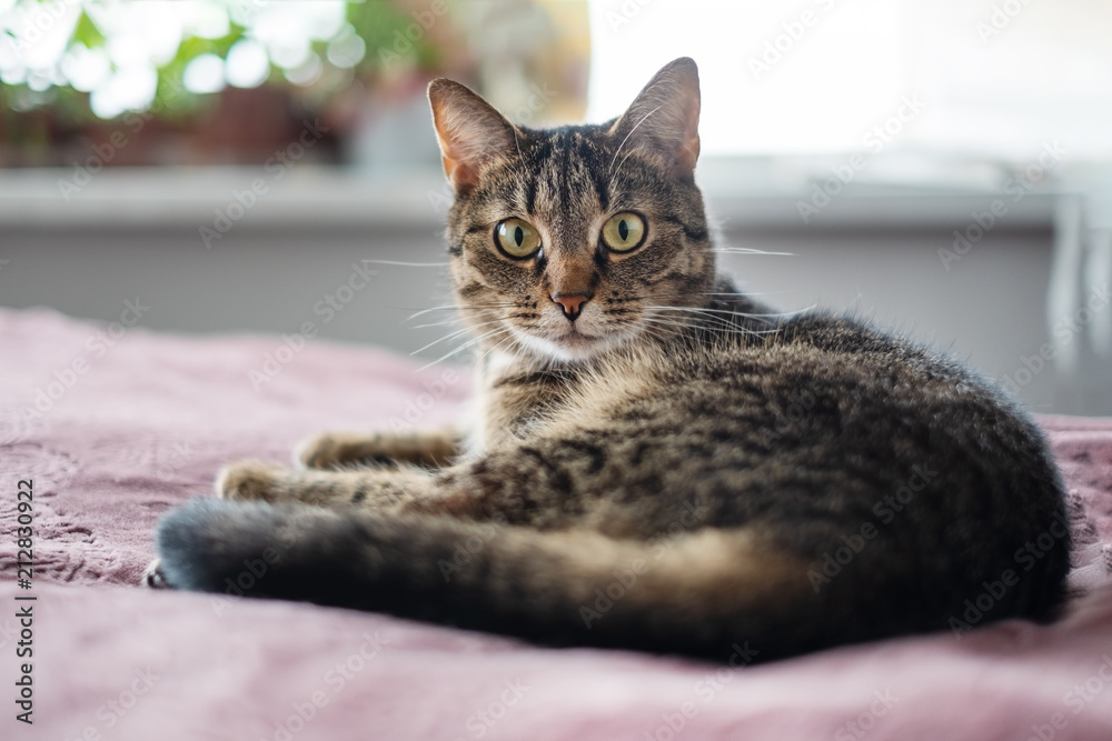 tabby cat lying on the bed and looking at camera