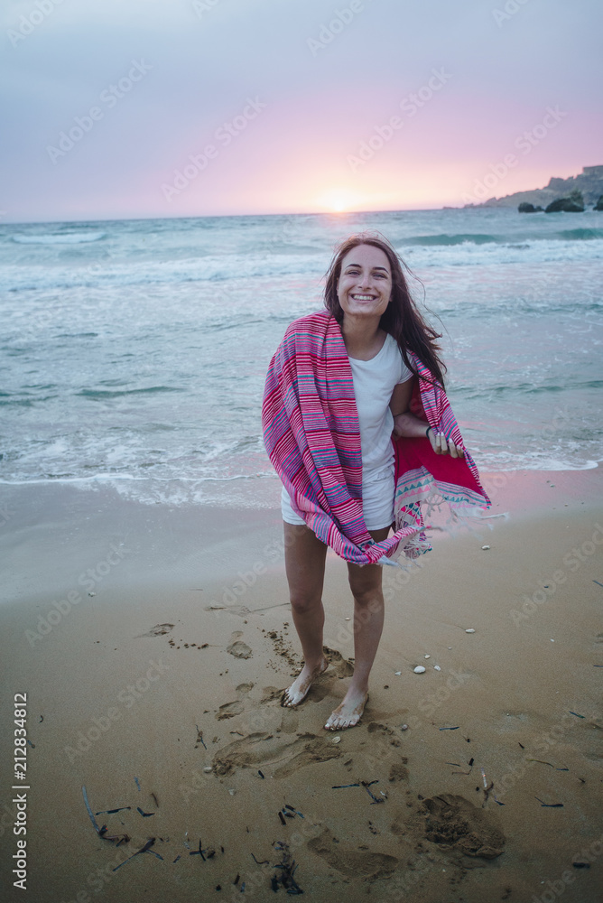 Portrait of happy beautiful young woman with pink blanket smiling while standing on the beach with white sand and blue sea against pink and purple sunset. Ocean. Summer. Freedom