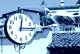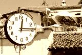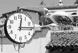Clock, 12:15 p.m. in front of terracotta roofs and white walls/vacation.