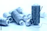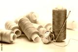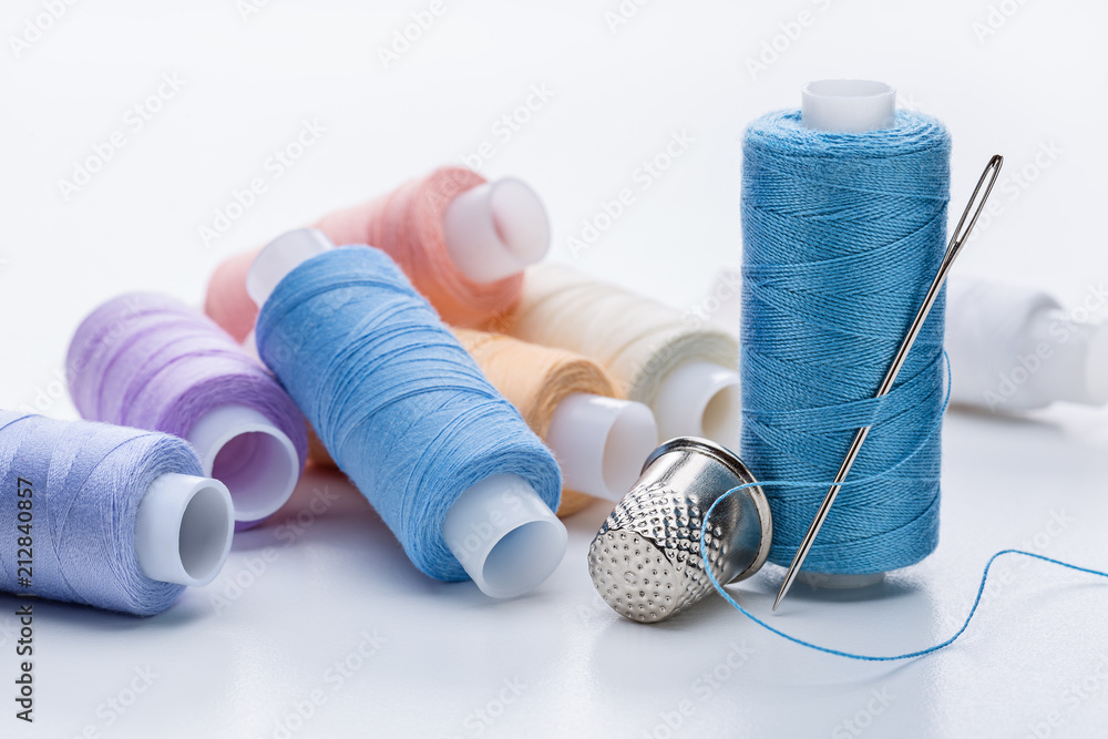 Set of multicolored threads on reels, large needle for sewing and thimble.
