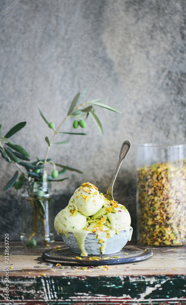 Bowl of pistachio ice cream with green pistachio nuts on wooden kitchen counter, concrete wall at background, copy space. Summer refreshing ice cream dessert